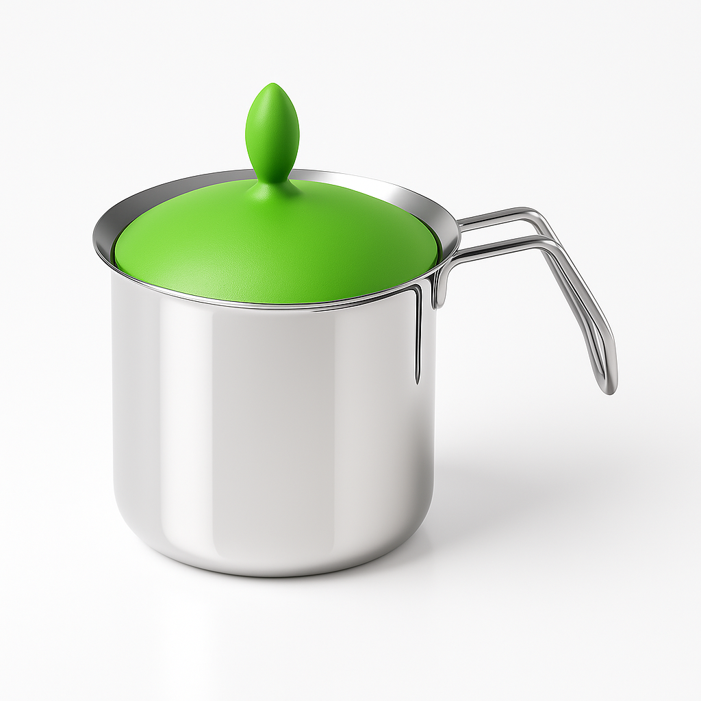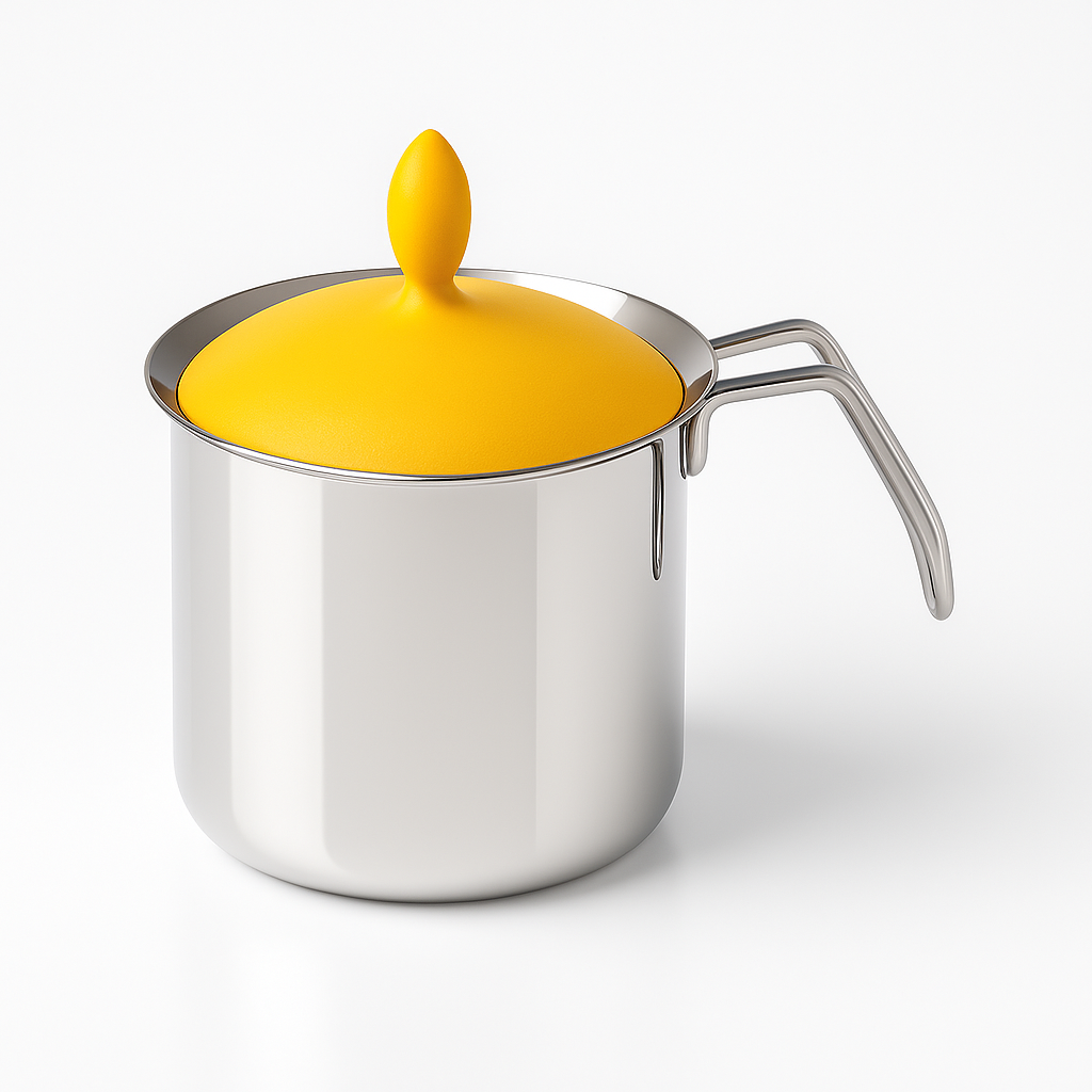 Il bollilatte in acciaio inox è lucidato a specchio, mentre il meccanismo manuale è disponibile in diversi colori.